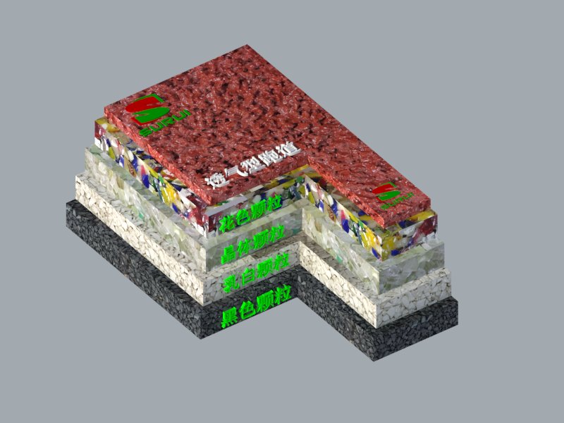 1、 面層采用EPDM(三元乙丙)膠粒,使之具有高度紫外線抵抗力,實(shí)踐證明,無(wú)褪色,強(qiáng)力耐磨。